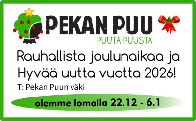 Olemme lomalla 22.12.2025 – 6.1.2025 Pekan Puun väki toivottaa Rauhallista joulunaikaa ja Hyvää uutta vuotta 2026!